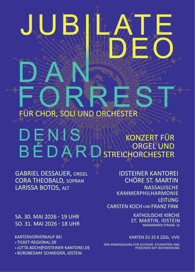 Mit dem groß angelegten Chorwerk „Jubilate Deo“ bringen die Idsteiner Kantorei und die Chöre von St. Martin im Mai 2026 erneut Musik des zeitgenössischen US-amerikanischen Komponisten Dan Forrest zur Aufführung.